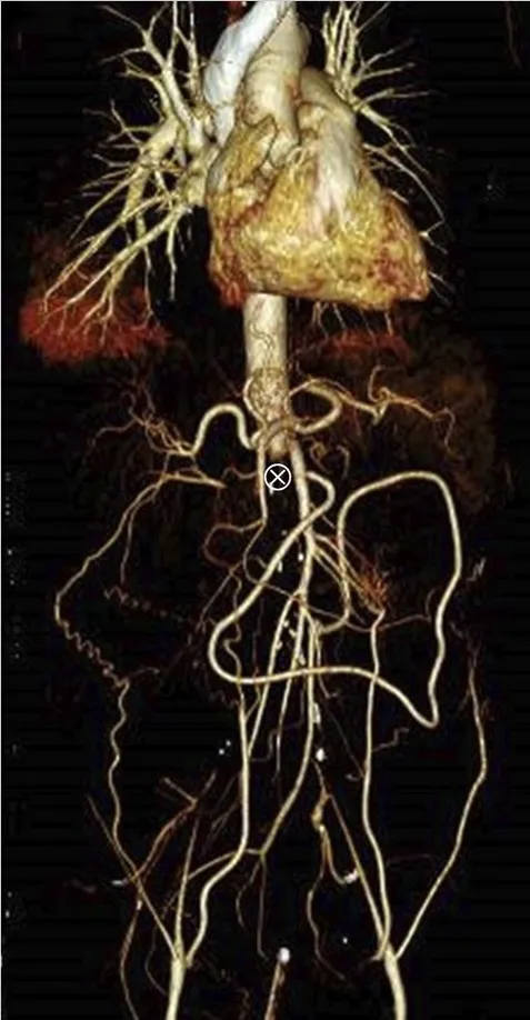TC con contraste (reconstrucción 3D) mostrando oclusión aguda de la aorta justo superior a la arteria mesentérica. (A) Oclusión aórtica justo superior a la arteria mesentérica (marcada con un ⊗) junto con vasos colaterales en la pared abdominal (B) Riñón izquierdo con realce de contraste y riñón derecho sin realce, lo que sugiere falta de perfusión renal.
