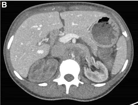 Se realizó una ecografía renal con Doppler que mostró ecogenicidad y tamaño renal normales, pero signos de oclusión aórtica en la emergencia de la arteria mesentérica superior, lo que fue confirmado por una tomografía computarizada con contraste (Figura 1).