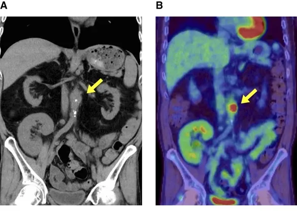 Achados de imagem na aortite infecciosa. (A) TC no 6º dia mostra abaulamento focal e calcificação da parede anterior da aorta abdominal, próxima à artéria mesentérica superior, com borramento da gordura ao redor (sinal de inflamação). (B) A PET/TC no 16º dia evidencia captação de fluorodeoxiglicose (FDG) na mesma região, indicando inflamação ativa.