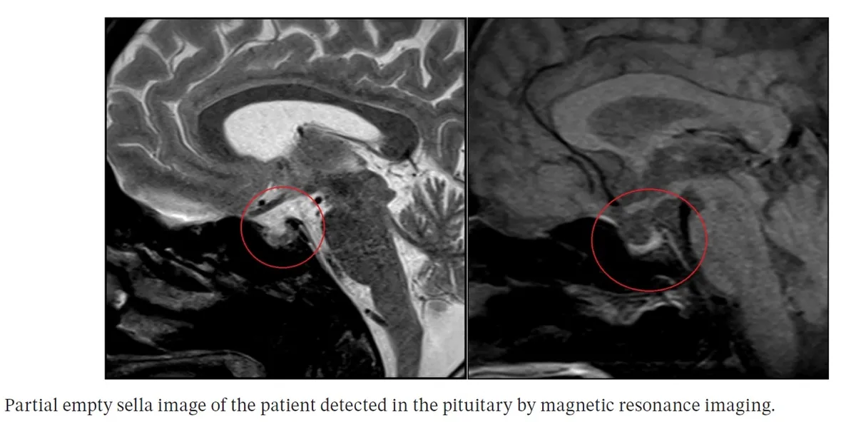 Realizado investigação laboratorial que revelou cortisol matinal de 6,2 µg/dL, ACTH de 39 pg/mL, TSH 3,2 UI/dL e testosterona 0,044 ng/mL . Diante dos baixos níveis de cortisol foi realizado o teste de estímulo do ACTH, não sendo demonstrado uma resposta adequada, com cortisol máximo de 8,27 µg/dL. A ressonância magnética revelou sela túrcica parcialmente vazia,** confirmando o diagnóstico de insuficiência adrenal secundária.**