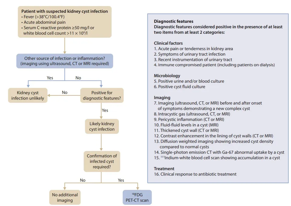 A presença de leucócitos na urina, piúria, urocultura positiva e sensibilidade à palpação localizada aumentam a suspeita de infecção cística. Na infecção de cisto, a urocultura geralmente é negativa, pois o cisto frequentemente não se comunica com o sistema coletor. Organismos mais comuns incluem bacilos gram-negativos, principalmente E. coli, nesse caso o mais esperado é o achado de hemocultura positiva!