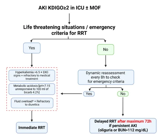 Fluxograma prático para decisão de quando iniciar TRS na IRA na UTI. Adaptado de Barbar et al., Intensive Care Med. 2025.