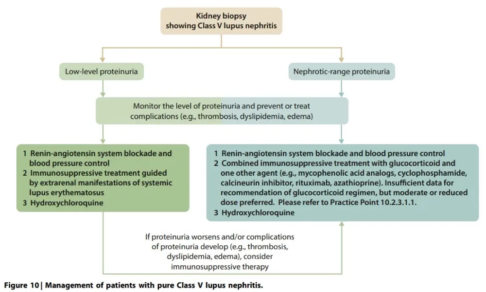 Se o paciente possuir proteinúria subnefrótica, o tratamento imunossupressor deve ser guiado pelas manifestações extrarrenais. Porém, diante de pacientes com proteinúria mais intensa (>3,5 g/dia) o manejo imunossupressor muda completamente (ver figura abaixo).