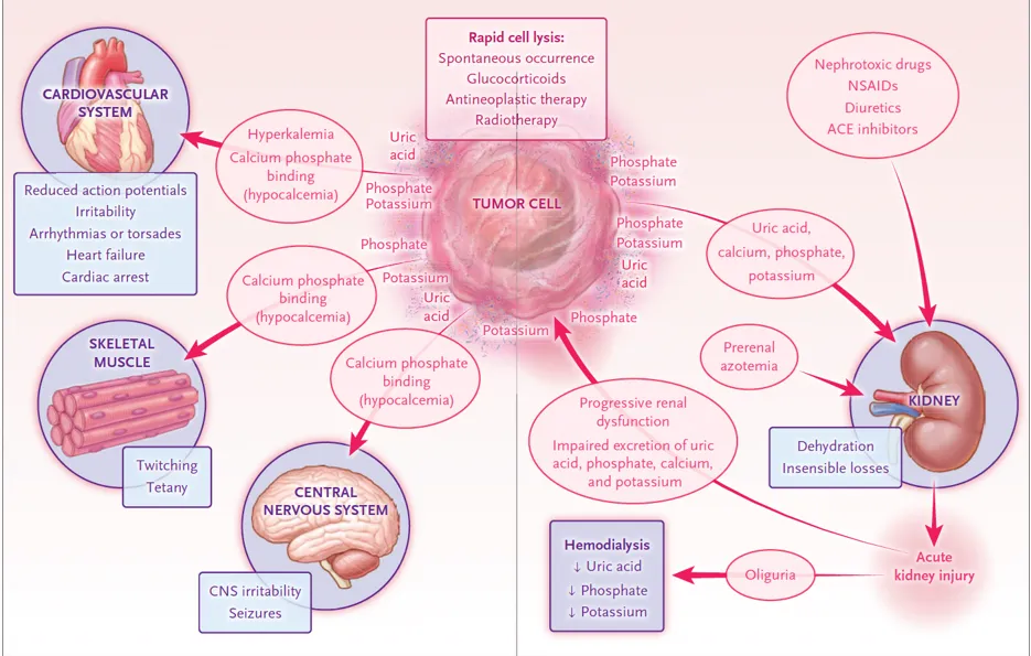 A lise rápida de células leva à liberação de substâncias intracelulares — principalmente ácido úrico, potássio e fósforo — na circulação, produzindo efeitos sobre o sistema cardiovascular, musculatura esquelética, sistema nervoso central e rins. Esses efeitos renais podem ser agravados pela presença de azotemia pré-renal e pelo uso concomitante de drogas nefrotóxicas. A lesão renal aguda resultante reduz a excreção de potássio, fósforo e ácido úrico, levando à progressão do desequilíbrio metabólico e, eventualmente, à necessidade de terapia renal substitutiva (hemodiálise).