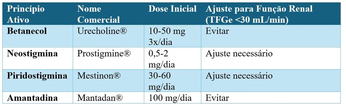 * Betanecol (Urecholine®) - Dose inicial: 10-50 mg, 3x/dia.